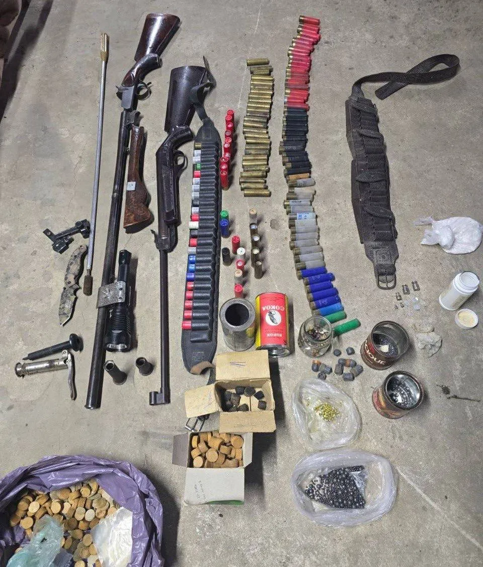 Potrivit informațiilor oferite de autorități, au fost ridicate două arme, una pneumatică și una cu țeavă lisă, mai multe cartușe, tuburi de cartuș, precum și materiale utilizate pentru confecționarea munițiilor.