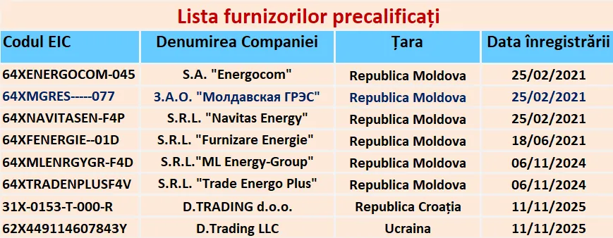 De notat că printre cei opt furnizorii precalificați se numără atât furnizorul central – Energocom, cât şi alte companii locale precum Furnizare Energie SRL, Navitas Energy SRL (parte a grupului Premier Energy), ML Energy-Group SRL şi Trade Energo Plus SRL.