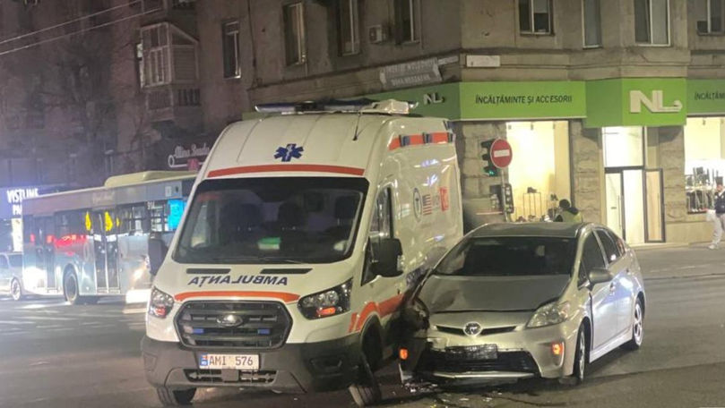 Ieri seară, 13 noiembrie, la intersecția străzii Vasile Alecsandri cu bulevardul Ștefan cel Mare din Chișinău, o ambulanță de model Ford a fost implicată într-un accident rutier, colizionând cu un automobil Toyota.