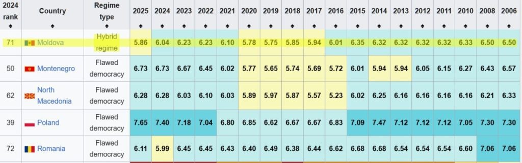 Potrivit deputatului, această evaluare arată că în Republica Moldova democrația se deteriorează, slăbesc instituțiile, scade nivelul concurenței politice, iar încrederea în sistem este în scădere. Gaik Vartanean a subliniat că, în timp ce alte state au reușit să-și îmbunătățească pozițiile în clasament, Moldova a coborât.